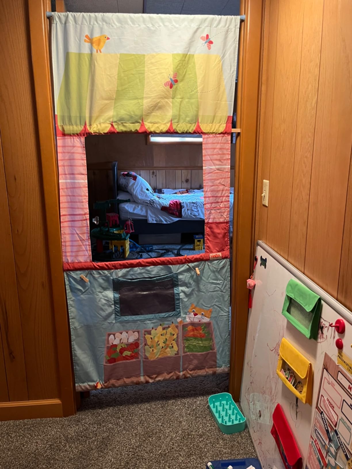 „Auf zum Markt, auf zum Markt!“ Verwandeln Sie jede Türöffnung in einen magischen Mini-Marktplatz mit unserem Türrahmen-Spielwarenladen , einem kompakten und wunderschön illustrierten Kaufladen zum Rollenspiel, der für fantasievolle Kinder ab 18 Monaten entwickelt wurde. Mit nur wenigen Handgriffen kann Ihr Kind einen normalen Türrahmen in eine belebte Ladenfront verwandeln – perfekt für stundenlanges, kreatives und bildschirmfreies Spielen.